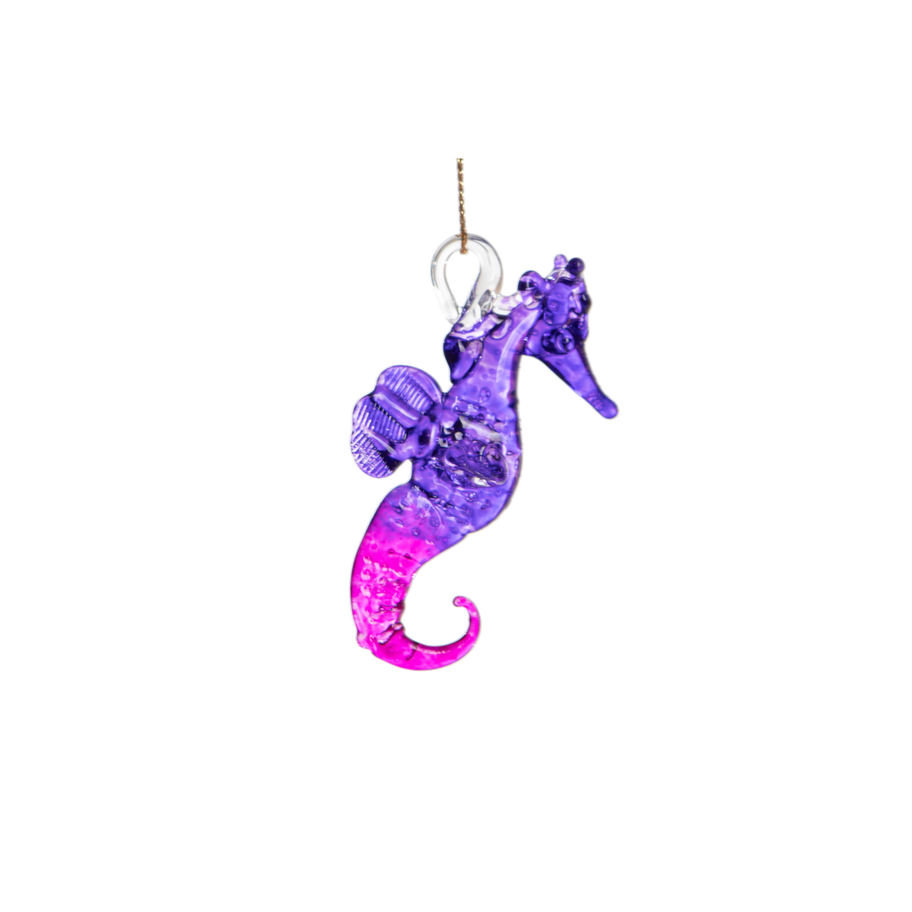 This blown glass seahorse brings a vibrant burst of color inspired by the sea. Its smooth glass body and curled tail reflect the light beautifully, displaying shades of blue, green, purple, and pink. It makes a lovely accent for windows, desks, or any place that needs a touch of ocean charm.