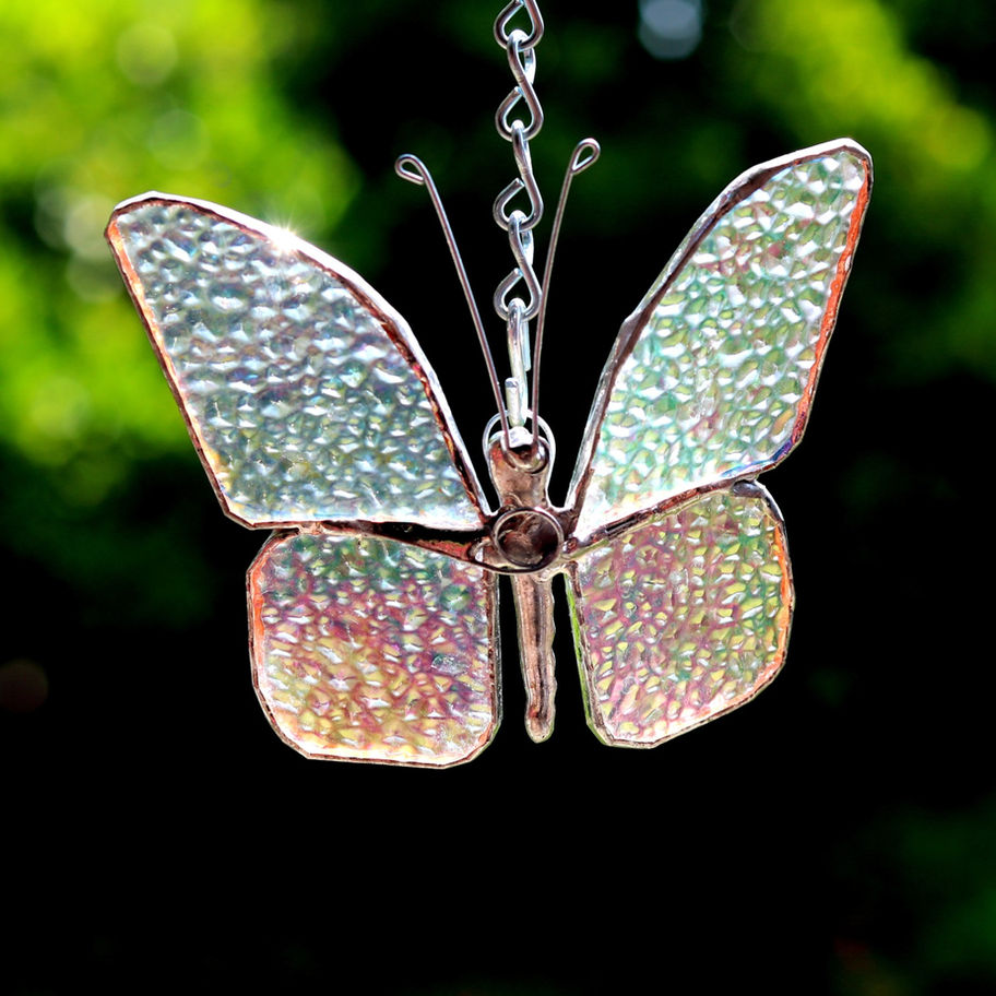 This stained glass butterfly brings a vibrant splash of color and elegance to any space. Each butterfly has richly colored glass wings that shine beautifully in sunlight. It makes a charming addition to windows, gardens, or seasonal displays. With several colors available, it fits different moods and settings. Able to hang straight up or flying, the little hook on the back is bendable so you can manipulate the angle.
